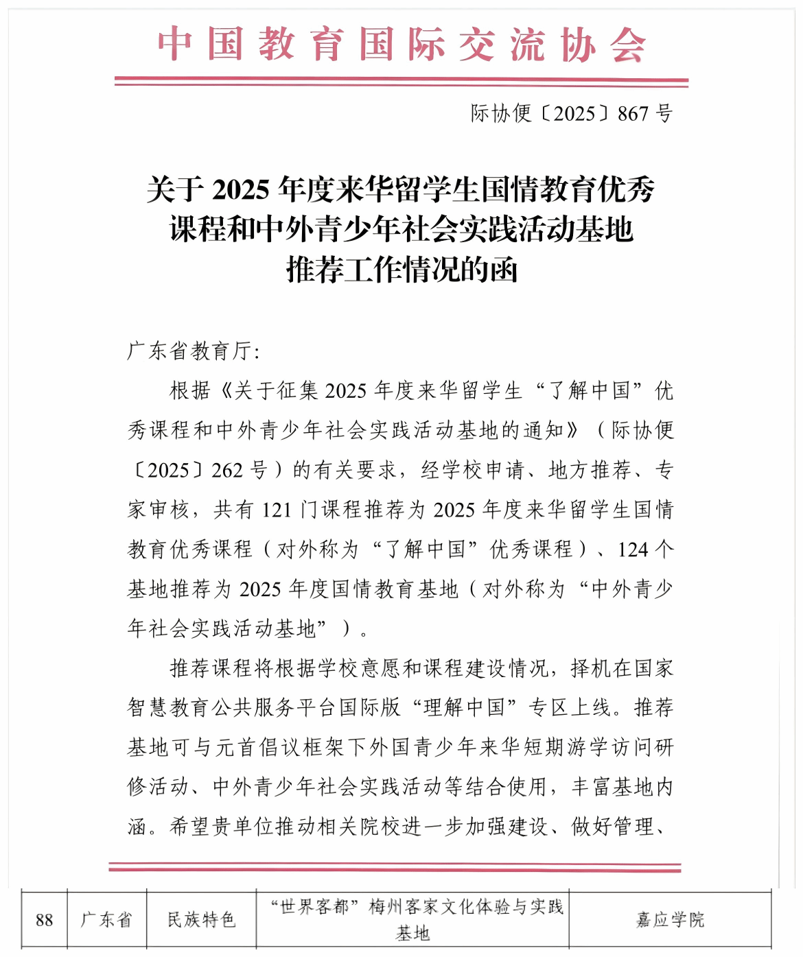 1月下旬,中国教育国际交流协会公布2025年度中外青少年社会实践活动基地名单。由我院与学校对于交流与合作部、中国客家博物馆联合申报的“‘世界客都’梅州客家文化体验与实践基地”,成功入选,系全国124个基地之一。